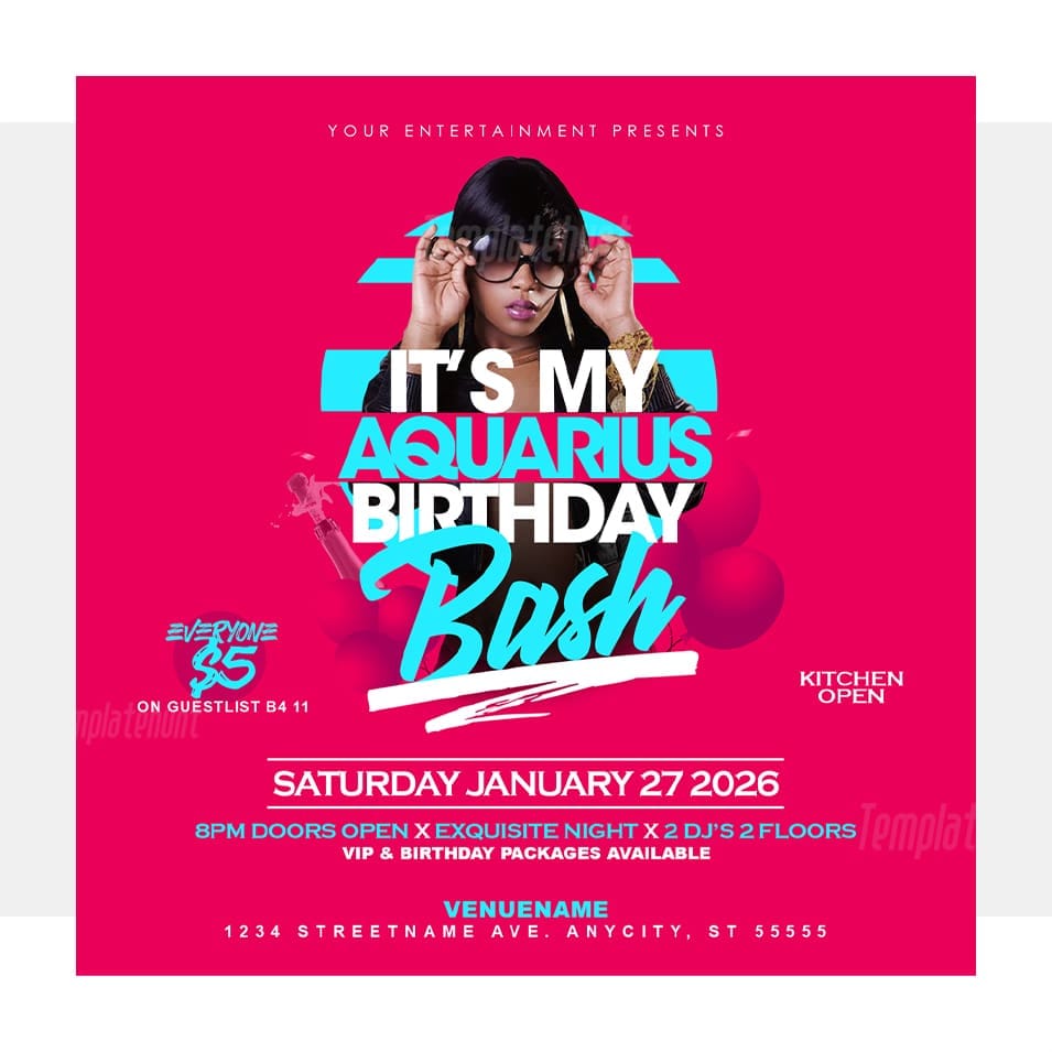 Aquarius zodiac invitation template for a Aquarius party. Template is fully editable with Photoshop.