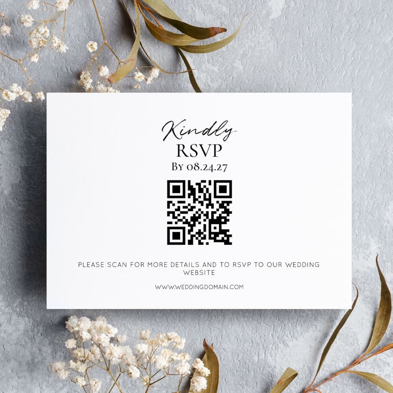 Wedding RSVP Card with a QR code to scan. Get A Free QR Code by clicking here.